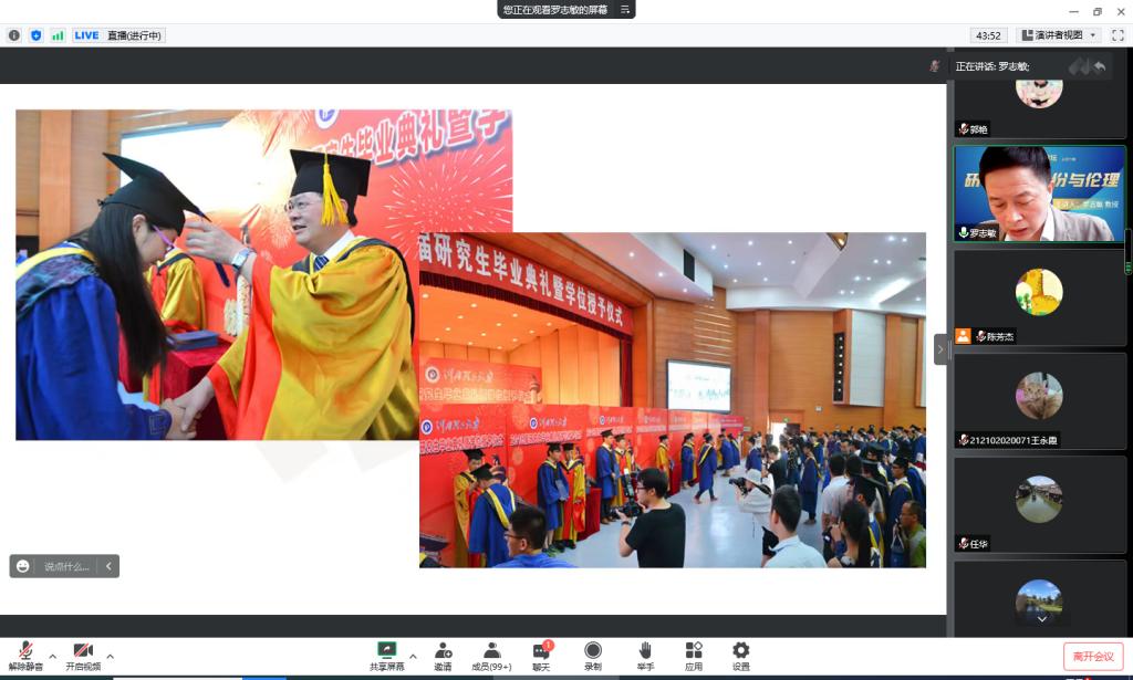 为进一步提升研究生培养质量,2022年12月4日上午,由党委研工部、研究生院主办,应急管理学院承办的研究生第95期“知行讲坛”活动以线上形式举办。本次讲座特邀郑州大学特聘教授、博士生导师罗志敏主讲,题为《研究生的身份与伦理》。讲座由应急管理学院副院长任华主持,参会师生约300余人。