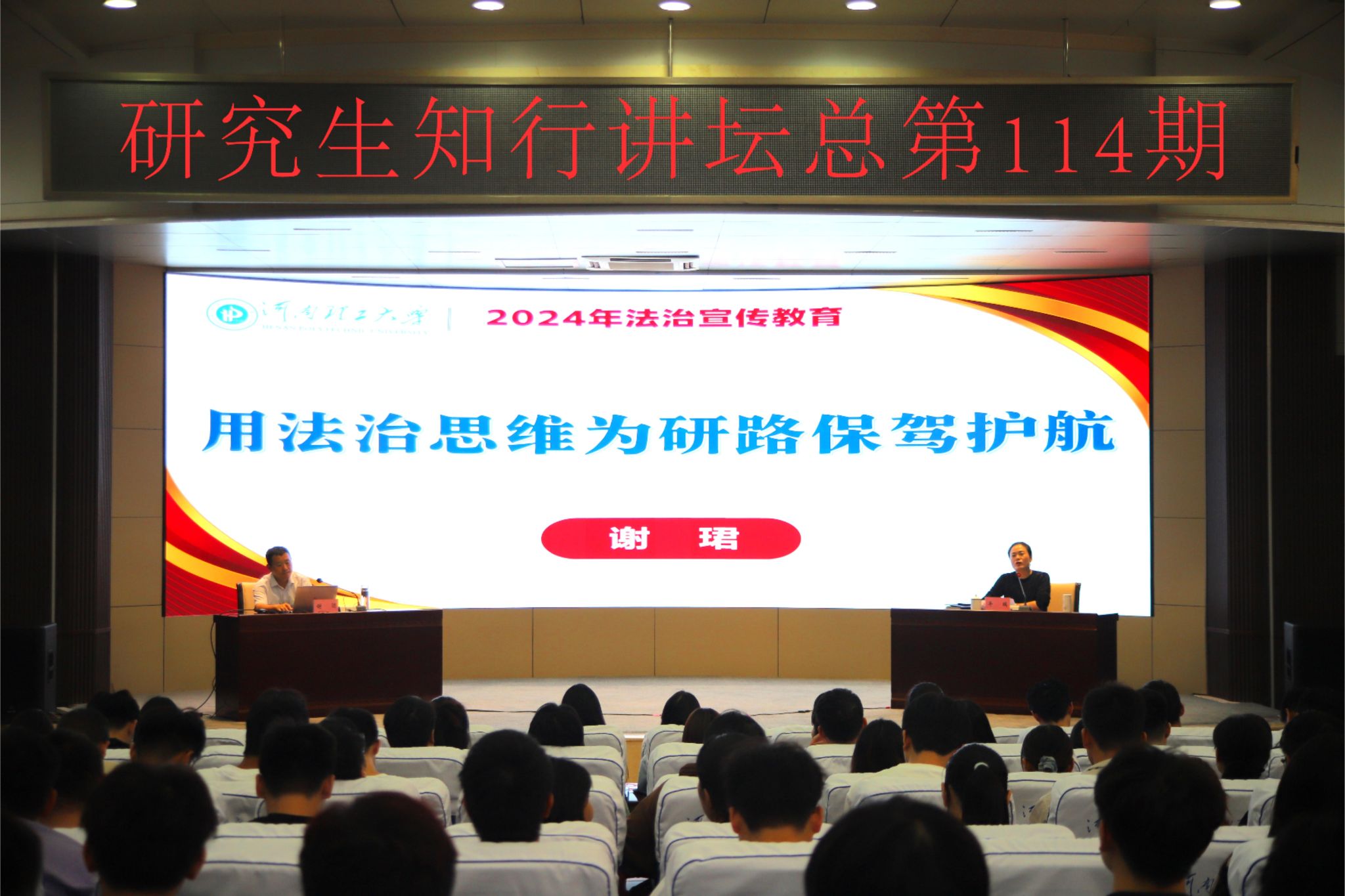9月25日下午,我校第114期研究生知行讲坛活动在力行楼学术报告厅举办。本次活动邀请文法学院副院长谢珺以“用法治思维为研路保驾护航——研究生学习生活中的常见法律问题”为题,为现场300余名研究生作专题讲座。活动由研工部部长平瑞主持。