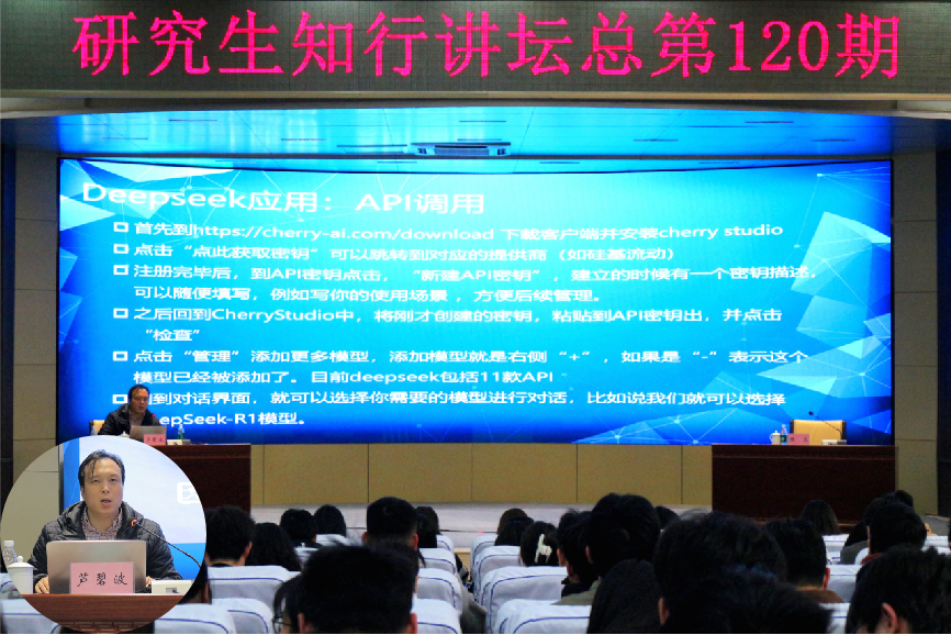 3月12日下午,由党委研工部主办、计算机学院承办的第120期研究生知行讲坛活动在力行楼学术报告厅举行。本次活动特邀计算机学院芦碧波教授开展以“人工智能与Deepseek赋能学科交叉融合”为题进行专题报告,三百余名研究生现场聆听。