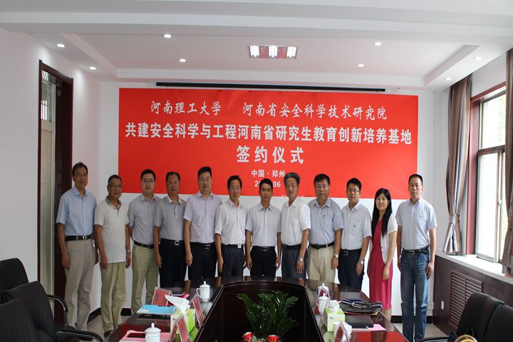 6月29日上午,副校长周英率研究生院、安全学院负责人一行7人,到河南省安全科学技术研究院参加“河南理工大学河南省安全科学技术研究院共建安全科学与工程河南省研究生教育创新培养基地”合作协议签署仪式,并为研究院的专业学位硕士研究生导师颁发聘书。河南省安全生产监督管理局总工程师徐照昇、河南省安全科学技术研究院院长程金虎、副院长周朝辉,研究院矿山所、危化所、职业危害所等部门主要负责人、企业导师和基地学生代表等参加协议签署仪式与座谈。