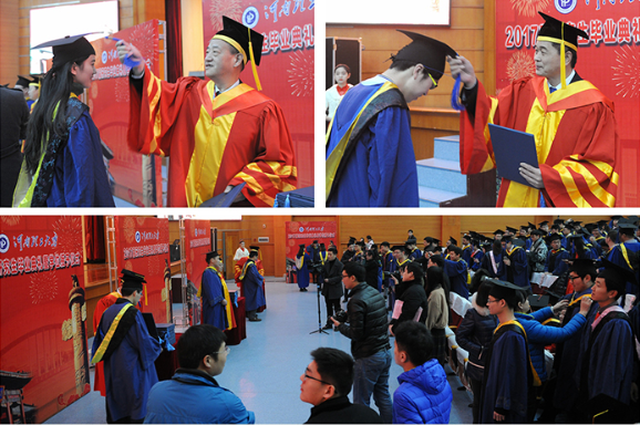 在学位授予仪式阶段,校领导为全体2017届硕士毕业生拨流苏,颁发学位证书并一一合影留念。