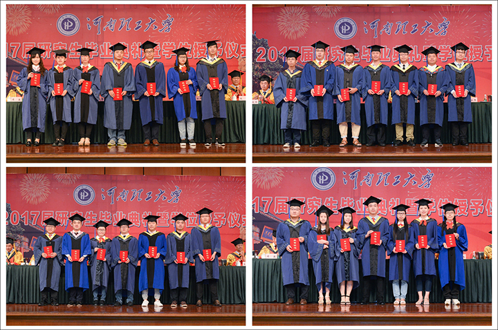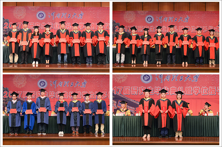卫中玲、安士伟、张锟和赵俊伟分别宣读了授予博士和硕士研究生毕业证、授予硕士研究生学位证、优秀学位论文和优秀实践成果评选结果的通知以及表彰省级和校级优秀毕业生的决定。校领导为2017届博士研究生代表颁发了毕业证书,为2017届省级和校级优秀毕业生、校级优秀博士和硕士学位论文和优秀实践成果奖获得者颁发荣誉证书并合影留念。