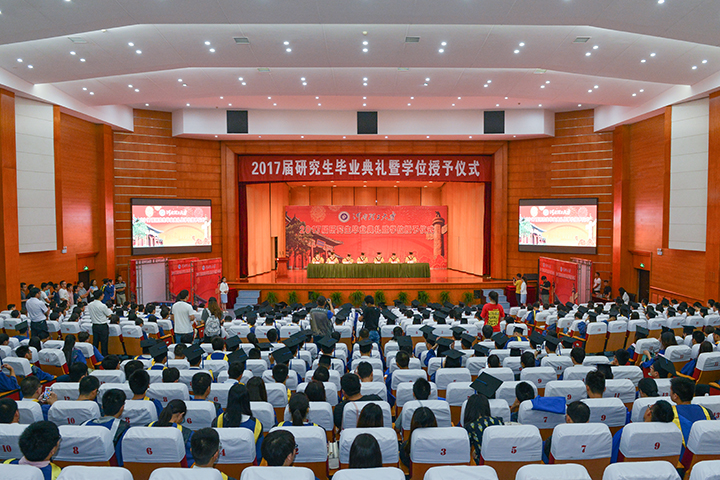 仪式分两个阶段进行。第一阶段在庄严激昂的国歌声中拉开帷幕。典礼上,杨小林代表学校党委、行政和全校师生向617名顺利完成学业的全体研究生表示热烈的祝贺,向各位导师、家长表示敬意和感谢。接着,他深情回顾了2017届毕业生的成长历程及近几年学校研究生教育发展取得的进步。最后,他向即将离开母校的毕业研究生提出了三点希望:一是不忘初心,追求人生宽度。“心中有信仰,脚下有力量”,理想指引人生方向,信念决定事业成败。期望同学们顺应时代发展,把握社会脉搏,将自我发展与时代进步无缝对接,将实现人生价值与国家民族命运紧密联动,做时代先锋。二要坚守创新,刷新人生高度。大学是我国科技发展的主要基础所在,也是科技创新人才的摇篮。他结合2017届毕业研究生取得的成绩,希望同学们早日成为敢于创新、善于创新、享受创新的优秀青年。三要坚持学习,增加人生厚度。他引用“一万小时定律”,告诫同学们无论从事什么职业,都要坚持久久为功的信念。希望同学们专攻博览,关心国家、关心人民、关心世界,把所学知识内化于心,形成自己的见解和知识体系,在人生的拼搏中厚积薄发、披荆斩棘。