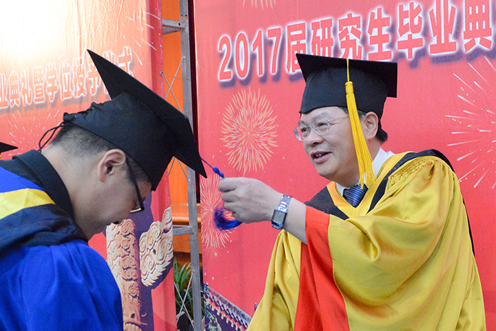 仪式第二阶段,出席仪式的校领导为2017届硕士毕业生拨流苏并合影留念。
