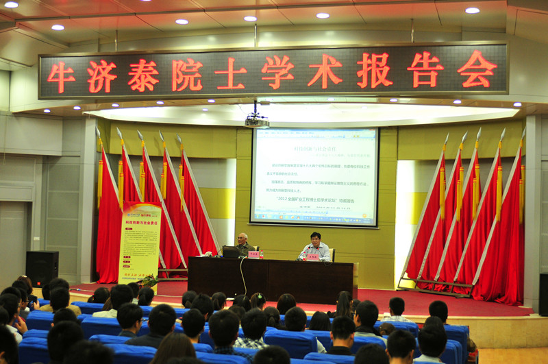 牛济泰院士的报告共分两大部分。第一部分题为“建设创新型国家是实现十八大两个宏伟目标的前提,也是每位科技工作者义不容辞的社会责任”。主要结合党的十八大相关文件精神,讲述了发展科技创新工作的重要性以及广大研究生应当肩负的责任和义务。第二部分题为“加强意志、品质和情商的修炼,学习和掌握辩证唯物主义的思想方法,努力成为创新型科技人才”。牛院士鼓励广大研究生要发散思维,注重思维的多元化,在日常的科研工作中,要学会容忍失败和敢于挑战权威,不要盲目迷信他人,相信自己的创造力,须知“创新永无止境”。他还指出,研究生要加强意志、品质和情商的修炼,这是创新型人才所必须具备的基本素质;还要学习和掌握辩证唯物主义的思想方法,是实现创新性成果根本保证。