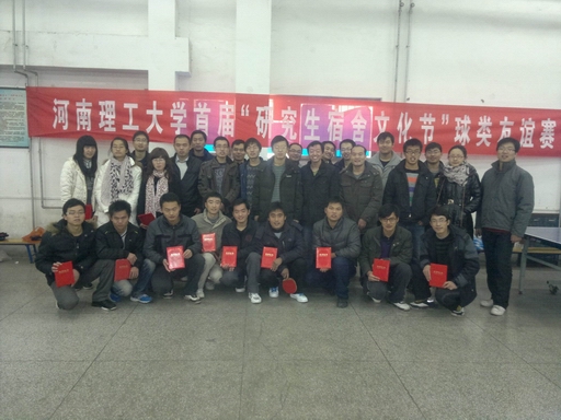 为了营造和谐环境、繁荣宿舍文化、加强研究生之间的交流、丰富研究生的业余文体生活,由研究生工作部主办、校研究生会承办的河南理工大学首届“研究生宿舍文化节”之“寝室对对碰”—球类友谊赛于2011年11月26日、27日圆满落下帷幕。