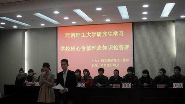 为深入开展学校核心价值理念宣传教育,引导全校研究生自觉践行学校核心价值理念。12月3日,由校党委研究生工作部主办、研究生社研会承办的学习学校核心价值理念知识抢答赛在计算机楼201会议室顺利举行,党委研究生工作部副部长王伟超和各学院研究生辅导员出席观看了比赛。