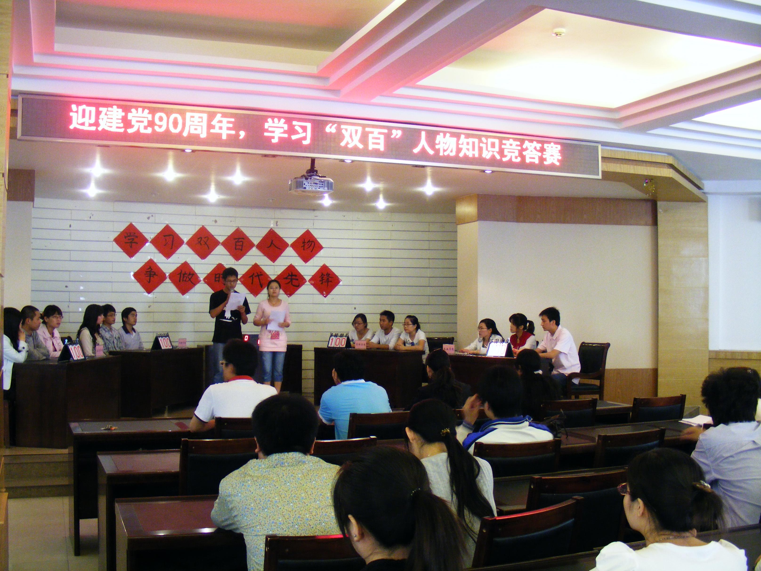 为缅怀我党伟大历史功绩,学习“双百”人物先进事迹,激发广大研究生的学习热情。5月24号下午在大学生活动中心招聘大厅举行了庆祝中国共产党成立90周年,学习双百人物知识竞答赛”预赛。研究生工作部副部长王伟超、研究生思想教育科张瑞庄、土木学院何军、材料学院吴文荣,理化学院马书启,资环学院赵秋芳和计算机学院王辉等老师与校研究生会全体成员及各学院200余名共同观看了此次竞答赛。
