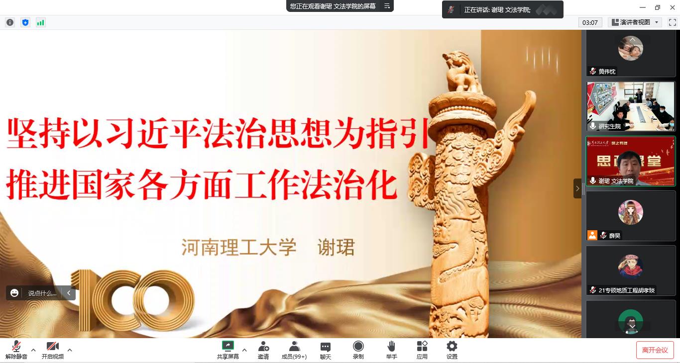 为深入宣传贯彻党的二十大精神,引导研究生工作队伍和全体研究生更好地学习习近平法治思想,坚定理想信念,2022年11月25日下午,研究生工作部部、研究生院邀请我校文法学院副院长、党的二十大精神专题宣讲团成员谢珺教授,作题为《坚持以习近平法治思想为指引 全面推进国家各方面工作法治化》的线上专题报告。本次讲座由研究生工作部副部长高志扬主持,研究生院全体教职工、研究生辅导员和部分研究生代表共300余人参加。