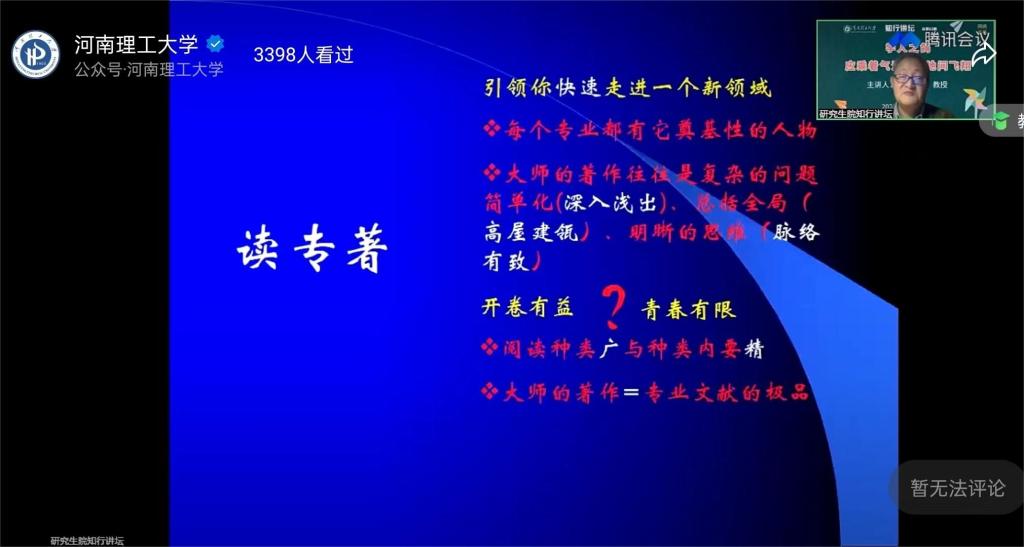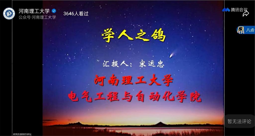 11月27日下午,由党委研究生工作部(研究生院)主办、电气工程与自动化学院承办的第93期研究生“知行讲坛”活动顺利举行。本期活动由电气学院宋运忠教授主讲,主题为“学人之鸽应乘着气流在天地间飞翔”。本次讲座采用线上腾讯会议形式进行,河南理工大学官方视频号同步直播,受众面达3000余人。会议由研究生工作部副部长高志扬主持。