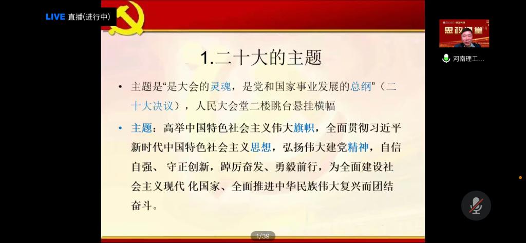 郑小九首先阐述了党的二十大的三大主题,一是旗帜,我们应高举中国特色社会主义伟大旗帜,全面贯彻习近平新时代中国特色社会主义思想,弘扬伟大建党精神,即坚持真理、坚守理想,践行初心、担当使命,不怕牺牲、英勇斗争,对党忠诚、不负人民;二是状态,高举旗帜,团结奋斗,自信自强,守正创新,踔厉奋发,勇毅前行;三是目标,全面建设社会主义现代化国家,全面推进中华民族伟大复兴。