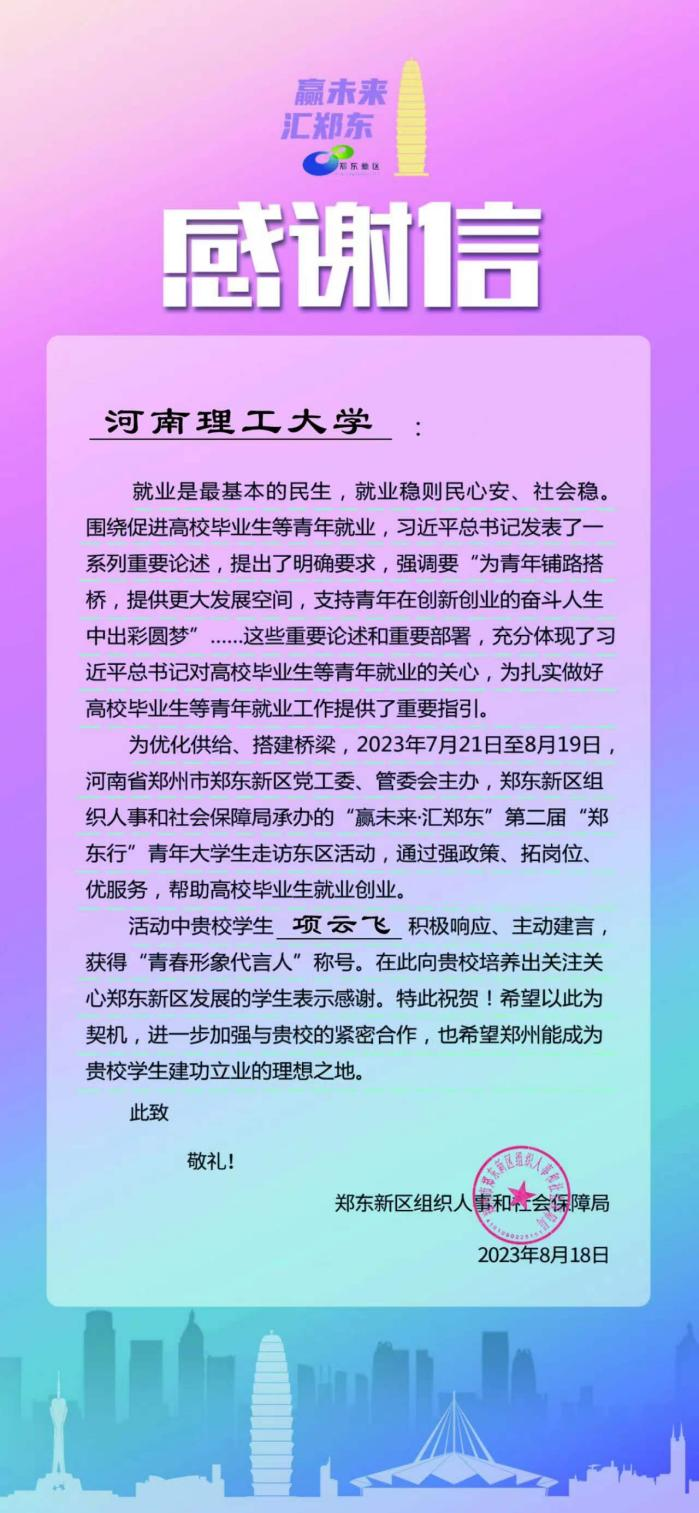2023年8月28日,郑东新区组织人事和社会保障局向我校发来感谢信,对机械学院2022级学生项云飞在郑东新区发展中积极响应、主动建言的表现表示感谢。