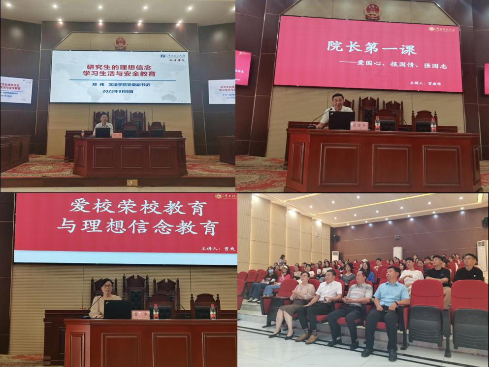 本次入学教育系列活动包括新生见面会,院长第一课,爱校荣校教育与理想信念教育,学术道德规范教育,入学教育,安全教育、宗教防范教育,专业教育,《研究生手册》学习,研究生日常心理素质教育等。入学教育系列活动中,院长冒建华、院党委副书记郑伟、文法学院副院长曹爽、法律硕士专业导师何平、中国语言文学专业导师张海媚、硕士生导师郜书锴教授、朱智秀副教授、刘坡副教授、辅导员史艺等,分别从政治思想、宗教意识、法律思维、爱校荣校、学术规划、学术态度、学术写作、心理健康等方面,引导2023级新生把个人理想追求融入当今的时代使命,用自己的专业知识为国家和民族的伟大事业添砖加瓦,不负时光、不负韶华。