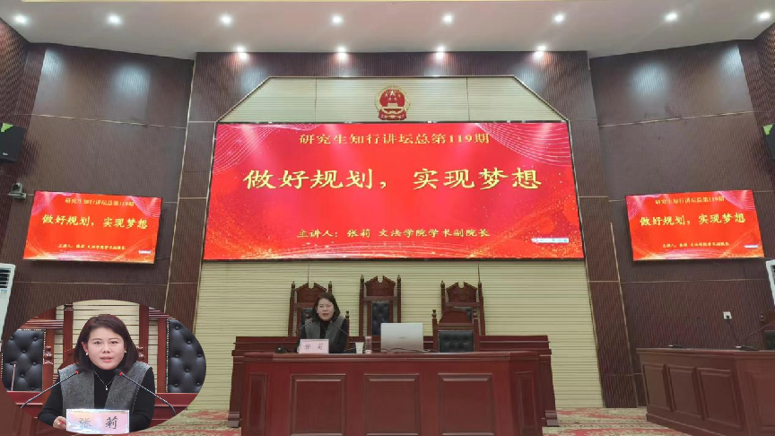 12月10日下午,由研工部主办、文法学院承办的第119期研究生“知行讲坛”活动在北校区模拟法庭举行。文法学院学术副院长张莉受邀作题为“做好规划,实现梦想”的讲座,在校研究生约120余人参加。