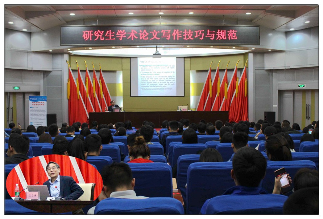 报告会上,卫教授以规范学术论文的重要性为切入点,详细阐述了英文学术论文中摘要和引言的写作技巧。首先,他从学术英语的起源、发展、规范性等方面层层推进对学术英语做了概要介绍,使同学们对研究性论文写作的重要性和规范性有了清晰的认识。接着,他深入浅出地给研究生讲授了英语学术论文中摘要写作的关键语步,以经典的词汇、语法、句型等进行多层次的指导,以“三个模式”对摘要写作的语步进行总结,并以具体实例论文进行了详细分析,使同学们在理论与实践的指导下更好地学习研究内容的表达手法和词汇的实现手段,提高论文摘要的写作能力。最后,他指出了英语学术论文中引言写作的“三个关键”,并以实例对写作步骤进行了详细介绍,使同学们对论文中引言部分的写作要求有了更加深刻的领悟。