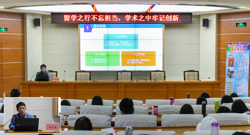 在交流会上,魏莉杰分享了自己在韩国两所高中做汉语教师志愿者的相关经历。首先她向同学们详细地讲解了如何通过国家汉办去往韩国做志愿者的流程,让有意愿出国进行汉语言文化教育和服务的同学有了清晰的认识。接着她从衣食住行、见面礼仪、隐私文化等方面介绍了自己在韩国的工作经历和日常生活并通过多张照片的展示,分享了自己与韩国学生们之间发生的种种趣事。最后,她对自己的赴韩之行进行了总结,并表示成为老师是一件很骄傲的事情,很感激自己在韩国学习交流期间收获了丰硕工作经验与珍贵的跨国友谊。李文睿通过回顾自己两年多的学习生活,与同学们进行了深入的科研经验交流。首先,他告诫同学们在研究生的学习生活中,一定要放平心态,要有耐心,积极适应研究生的生活节奏,并且把学习模式从被动转为主动,从宽泛学习方式转为有针对性地学习。其次,他建议同学们一定要有阶段规划,找准自己的定位,想清楚自己研一、研二、研三需要做的事情。接着,他从如何认清自己研究的领域现状,如何阅读文献,如何写好一篇论文等方面给同学们分享了自己的经验,让同学们对科研过程有了清晰的认识。最后,他还给同学们介绍了论文投稿的流程,在未来学习和工作生涯的规划方面也提了自己的见解。