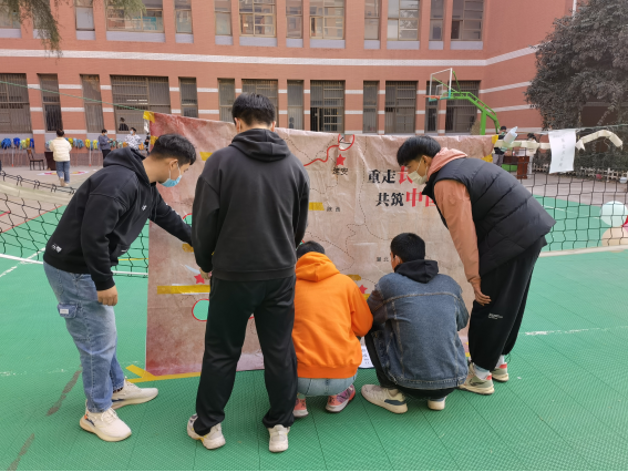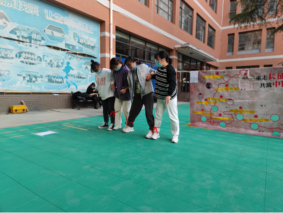 此次运动会分团体赛和个人赛,团体赛的项目有搭桥渡河、红军过草地、重走长征路、负重前行四个项目。红军过草地比赛中,同学们用绳子将自己的一条腿和另一位同学的腿绑在一起,四个人排成一排,相互扶持,一起喊着口号,艰难前进,宛如当年革命同志们手挽着手,为了心中的目标勇往直前,毅然决然走向危险的沼泽,还原了当年红军过草地的场景。个人赛的项目有听歌识曲、送鸡毛信、勇炸碉堡、党史问答,当一首首红色的歌曲回荡在操场上,当年的一幕幕景象仿佛出现在了眼前,特别是当“我和我的祖国”的旋律响起,同学们几乎同一时刻哼唱着这首歌曲,爱国主义的精神此刻流淌在每个人心中。赛场上,运动健儿们激情飞扬、奋力拼搏,工作人员追踪记录着比赛进程,拍下了一个个精彩的瞬间,整个场面热闹非凡,精彩纷呈。