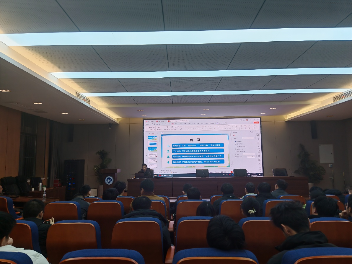 本次活动共涉及四个主题,邓沛奇围绕 “数智校园·与法同行” 的核心方向展开内容,投影幕布上的 PPT 呈现了丰富的学习板块:从全会精神的领航与习近平法治思想,到高校法治教育的实施要点,以及真实案例的生动解析,再到实用防护技巧的归纳总结,其间通过图表、图文结合的形式,直观展示了风险特点与应对要点,最后播放了一段法治宣传教育片《歧路·青春》的视频,让抽象的安全知识变得具体可感。