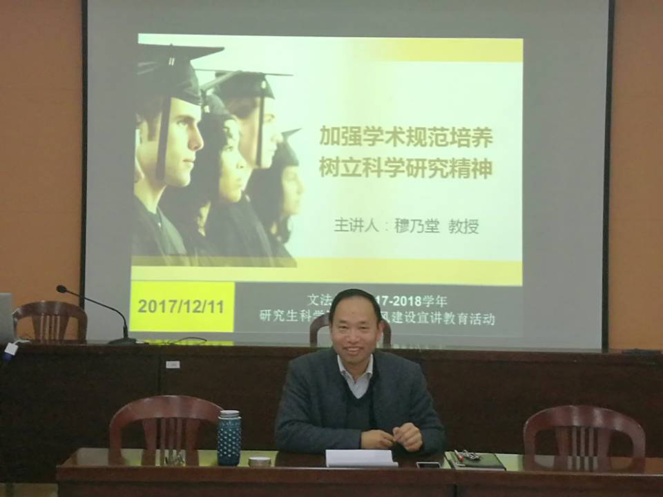 穆乃堂指出,作为一名研究生,要具备自学能力、思考能力和研究能力,要敢于质疑、批判,树立学术创新精神。同时,他提出学术规范与道德密切相关,是提高学术水平和研究能力的重要保障,并就目前学界侵犯他人著作权、一稿多投、参加与自己专业无关的评审工作等学术不端行为,引出了研究生学术不端的各种表现:夸大研究成果、一稿多投、虚假署名、抄袭剽窃、伪造事实等,针对各种学术不端行为进行了细致地讲解,以生动的事例和严重的后果建议同学们要做到以下几点:培养自律意识,坚守学术诚信;实事求是,忠于真理、探求真知;严谨治学,自觉遵守学术规范。最后,他针对学术规范问题对在场同学们提出了严格要求,希望同学们立足自己本专业,踏踏实实搞学术,认认真真做学问,在遵守规范的前提下,以格物致知的态度去探求真理。