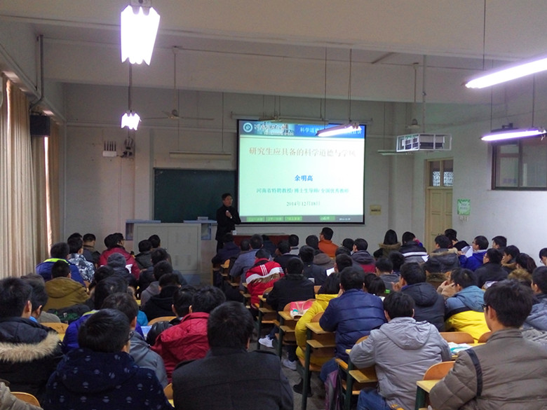 此次活动,余明高教授以当代研究生如何树立正确的科学道德观念为主题,列举了科研创作、学术研究中出现的杜撰、篡改、剽窃等学术不端行为,并说明其危害,使在座各位深知科研活动是一个严谨的过程,对科技事业而言,科学道德与学风问题直接影响到科学的繁荣发展。活动上,余明高教授还就2014级研究生即将接触的论文创作和发表展开系统讲解并指出科研上应遵守的具体规范,在座学生聚精会神的听着并做着记录,现场气氛十分融洽。
