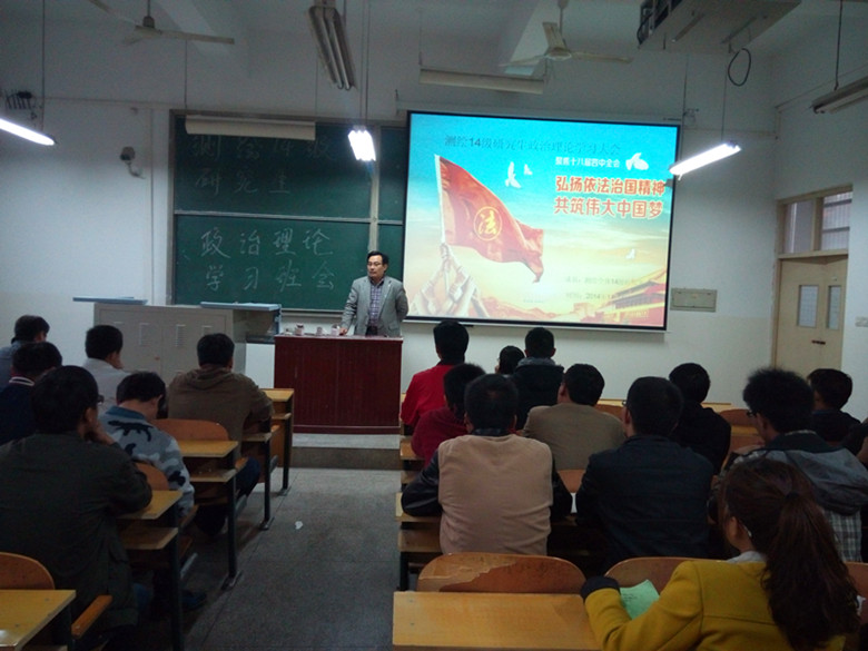 2014年11月4号,为弘扬依法治国精神,共筑伟大中国梦,根据学校研工部安排,测绘学院14级全体研究生在学院103教室组织召开政治理论学习大会,学习十八届四中全会精神,会议由研究生辅导员许传阳主持。