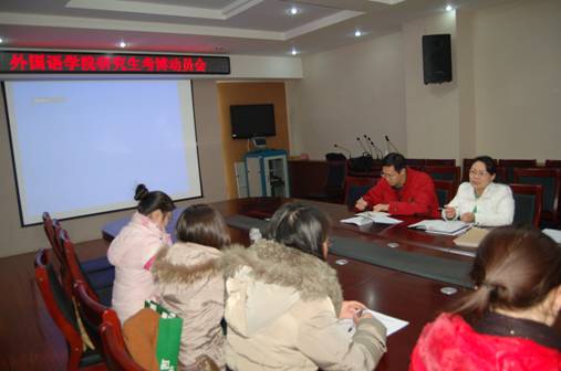 外国语学院于2013年11月7日下午4:30—6:00在文科综合楼外国语学院311会议室举行了“考博动员”大会。会议由我院党委副书记王哲主持,主要由我院主管研究生教学工作的李惠敏副院长对全体研究生进行考博动员。