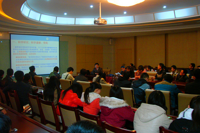 在会议中,景教授从科学道德、面临的的问题与挑战、科研规范、立足并热爱本专业四个大方面给大家生动的讲述了作为一名当代研究生在面对日常的学习中应注意的问题并强调:“科学道德与学风问题直接影响到科学的繁荣与发展,在科学的研究中要正确处理个人与个人、个人与集体、个人与社会之间的关系,树立良好的科学道德”更列举现实生活中的例子告诫大家切勿有任何违反科学道德的行为,鼓励大家通过学习他人理论的基础上,善于总结,提出自己的想法。