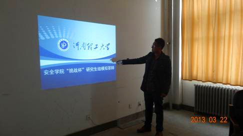 2013年3月22日,安全学院“挑战杯”研究生组模拟答辩在安全楼217室举行。答辩伊始,安全学院科创中心主任李阳对“挑战杯”课外学术科技作品竞赛的内容及注意事项进行了详细说明。