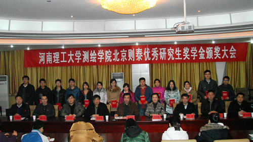 12月10下午,“河南理工大学测绘学院北京则泰优秀研究生奖学金颁奖大会”在测绘学院一楼会议室隆重举行。北京则泰集团总裁侯坤、办公室主任郭志成、解放军信息工程大学翟翊教授、测绘学院党委书记王晓梅、院长郭增长、副书记沈立、副院长袁占良、张合兵、牛海鹏等领导同志与测绘学院全体研究生参加了此次颁奖仪式,会议由党委书记王晓梅主持。