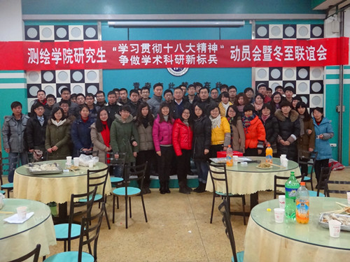 为贯彻十八大精神,增强学术科研精神,增进同学之间的交流, 12月21日,在四号餐厅二楼,测绘学院成功举办2012级研究生“学习贯彻十八大精神,争做学术科研新标兵”动员会暨冬至联谊会。测绘学院副院长牛海鹏,辅导员许传阳及2012级全体研究生参加了此次会议。