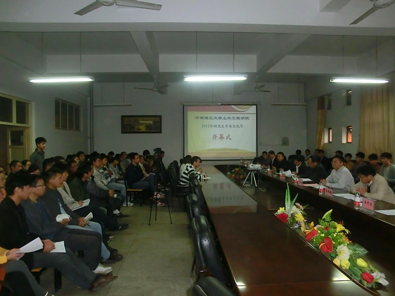 2012年10月16日下午,土木工程学院2012年研究生学术文化节在开幕式在土木工程学院会议室举行。校研究生处处长、研究生工作部部长赵同谦,研究生工作部副部长王伟超;土木工程学院党委书记朱天明,院长刘希亮,党委副书记张明,副院长王有凯、梁为民、余永强等出席了会议,该院各相关部门负责人及全体研究生参加了此次会议。会议由副院长余永强教授主持。