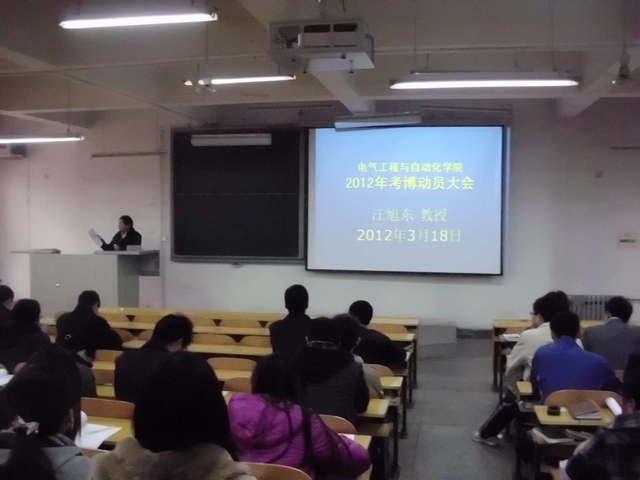 2012年3月18日上午,电气学院在DQ201教室召开了考博动员大会。出席此次会议的有电气学院副院长汪旭东教授,研究生辅导员徐孝卓老师及电气学院所有研究生。