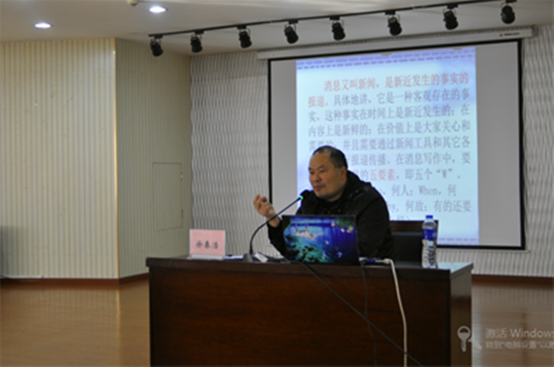 徐老师从新闻的分类分类入手,以最基本的新闻形式——“消息”为例,介绍了新闻的结构、特点以及注意事项,鼓舞大家积极提高自己的写作水平。然后,徐老师引入“伏明霞夺冠”、“学生智擒飞车贼”、“后勤人员义务缝补”等新闻热点,形象具体地使大家认识到新闻时效的重要性,指导大家如何挖掘新闻事件的新鲜度,告诫大家要发挥新闻的作用为社会传递正能量。最后,徐老师对自己的 “中国新闻奖”作品《有事情,找学生党员驿站》一文进行剖析,从此篇新闻的选题立意、思路整理、写作技巧做了详细的介绍。徐老师旁征博引、循循善诱,以自己丰富的写作经验和通俗易懂的语言,赢得了在场学生的阵阵掌声和喝彩。