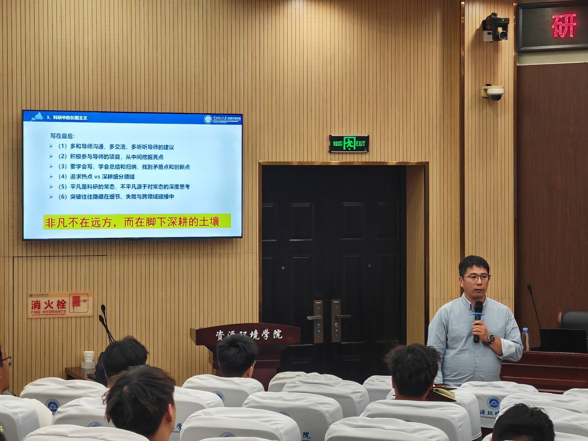 5月8日下午,由研工部主办、资环学院承办的第123期研究生知行讲坛活动在资环103报告厅举办。资环学院李云波教授受邀以“追求,让平凡而不凡”为题作专题报告,全校百余名研究生参会。