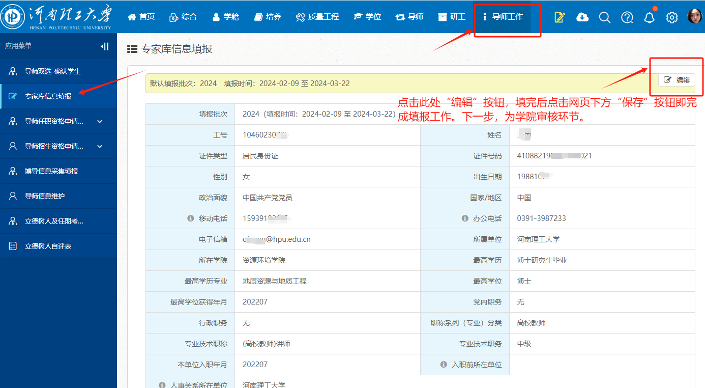 (一)原校内外导师完善和确认信息:登录研究生管理系统https://yjsgl.hpu.edu.cn/tp/view?m=up#act=portal/viewhome(图1),选择【导师工作】→【专家库信息填报】→右上角【编辑】,进行完善个人信息,确认无误后点击【保存】即可。学院负责人审核通过前,均可进行编辑和修改,学院审核通过后,导师将无法修改。